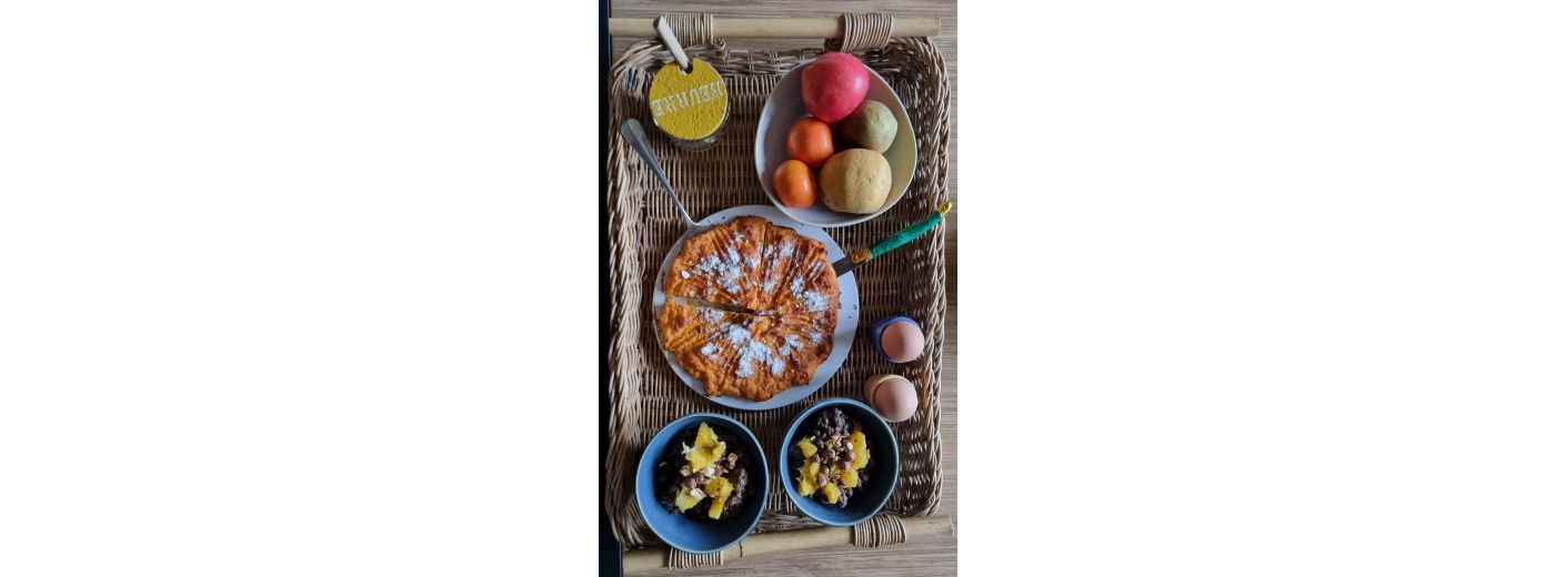 Le petit déjeuner est servi entre 7h30 et 9h30 dans le salon d'hôtes ou sur la terrasse aux beaux jours. Les pâtisseries sont faites maison, ainsi que les confitures, avec les fruits du verger.Le petit déjeuner peut se transformer en brunch.