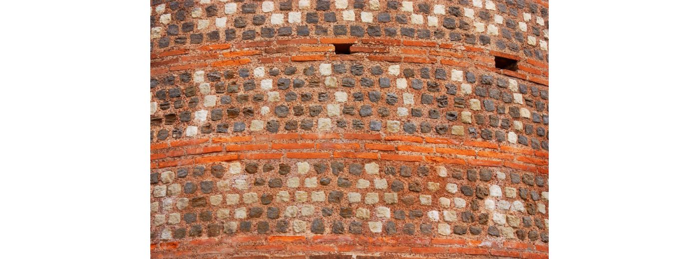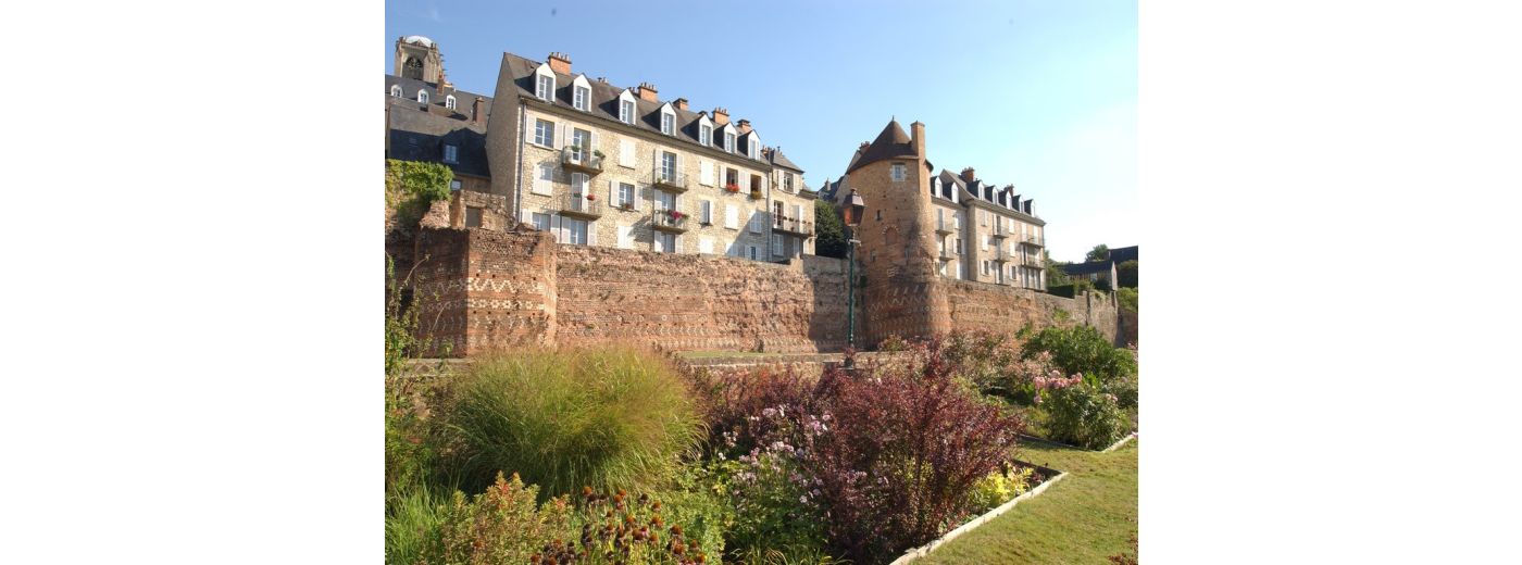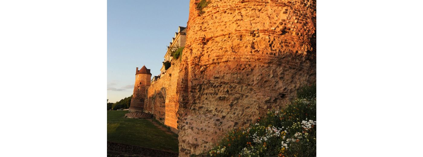 Sa construction de briques, de pierres de roussard liées par un mortier rose lui confère cette teinte caractéristique. Elle a été bâtie pour affirmer la puissance impériale : l'exceptionnelle richesse des parements, où se succèdent encore aujourd'hui sur plus de 8 m de haut des frises à décors géométriques, en est une trace magistrale. Monument rare, unique en France, la muraille demeure debout, quoique sans véritables fondations. Douze tours, une porte et trois poternes sont visibles. Ne manquez pas la tour du Vivier, la tour de la Madeleine, la tour de Tucé, la tour des pans de Gorron, la Grande Poterne,...